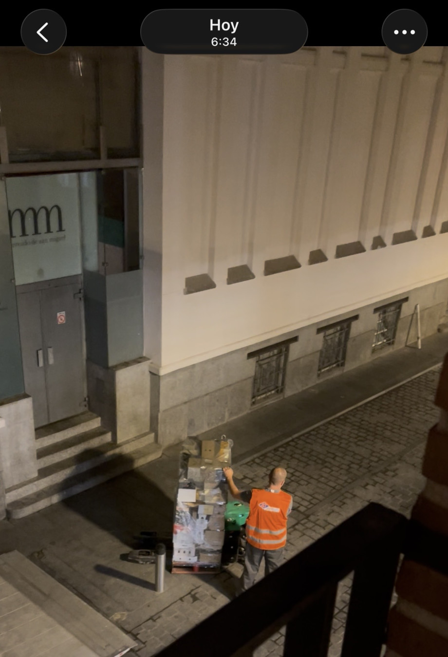 El DIA de la calle Conde de Miranda, trasera del Mercado de San Miguel, incumple reiteradamente la normativa en cuanto al horario de descarga de mercancía, desde las 6.30 de la mañana todos los días, incluyendo festivos y domingos. El ruido y las vibraciones dentro del edificio por el arrastre de la transpaleta sobre el suelo es tal que se mueve todo el edificio y en los pisos que quedan justo encima se nota como si estuviese ocurriendo un terremoto. Además de la vibración, el ruido es insoportable y tal como pudieron comprobar unos técnicos del Ayuntamiento excede por mucho el nivel de decibelios permitido.... El motor del camión, el ruido de la plataforma elevadora, las jaulas, el arrastre, voces, etc. y esto dura continuado durante una hora o más y así todos los días.