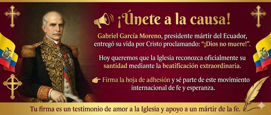 Con alegría y esperanza, invitamos a todos los fieles, asociaciones, comunidades y personas de buena voluntad a unirse en apoyo a la causa de beatificación extraordinaria de Gabriel García Moreno (1821–1875), presidente mártir del Ecuador. Su vida y su muerte son testimonio luminoso de fidelidad a Cristo y a la Iglesia.